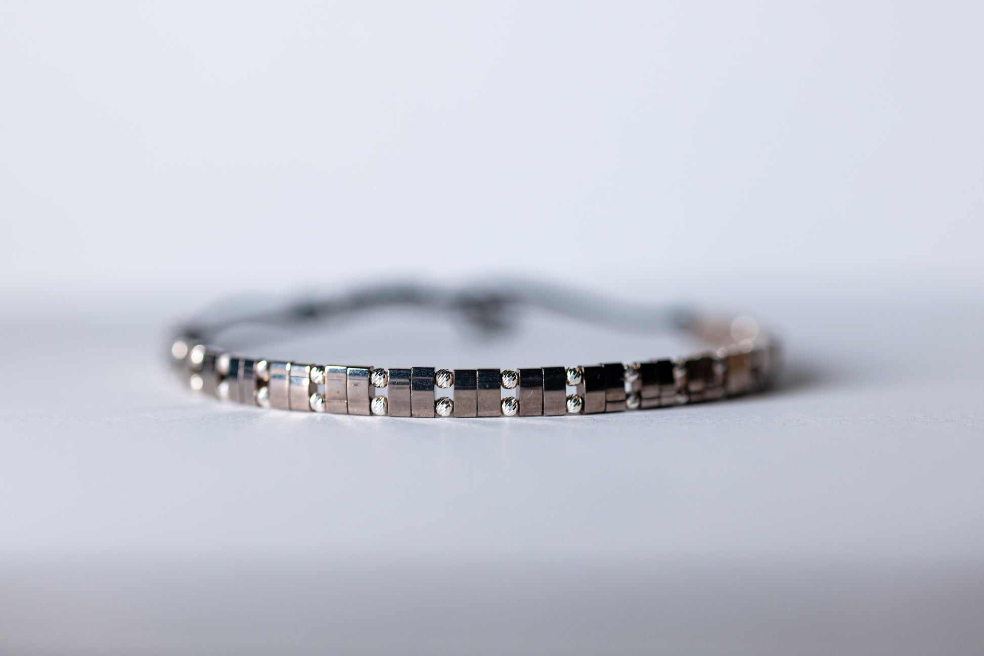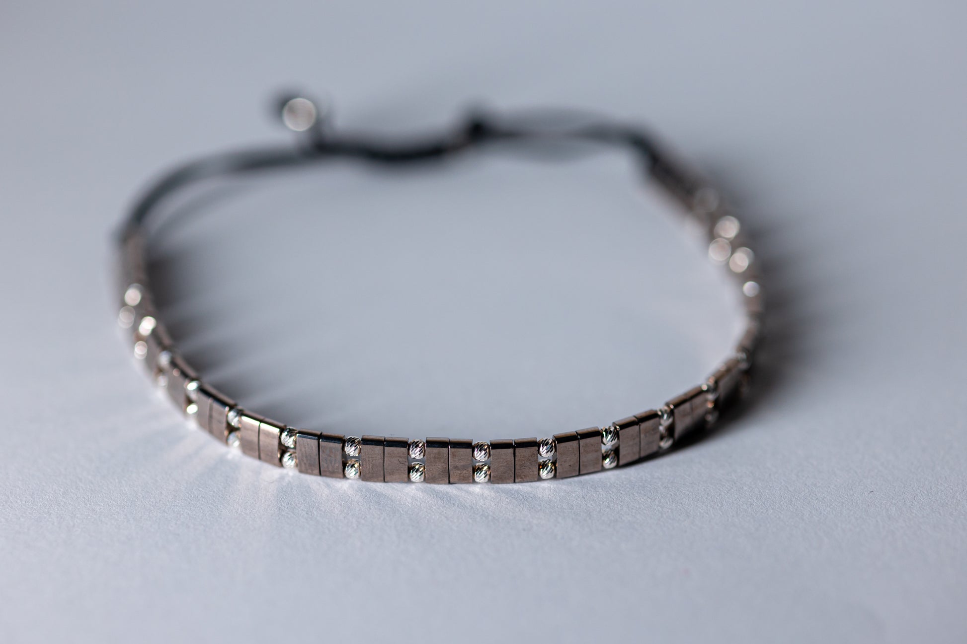 O brățară cu un design modern și echilibrat, realizată din mărgele rotunde din argint și mărgele Tila plate, placate cu nichel. Contrastul dintre luciul rece al argintului și geometria precisă a mărgelelor Tila oferă un look contemporan, rafinat, ușor de integrat în orice stil.