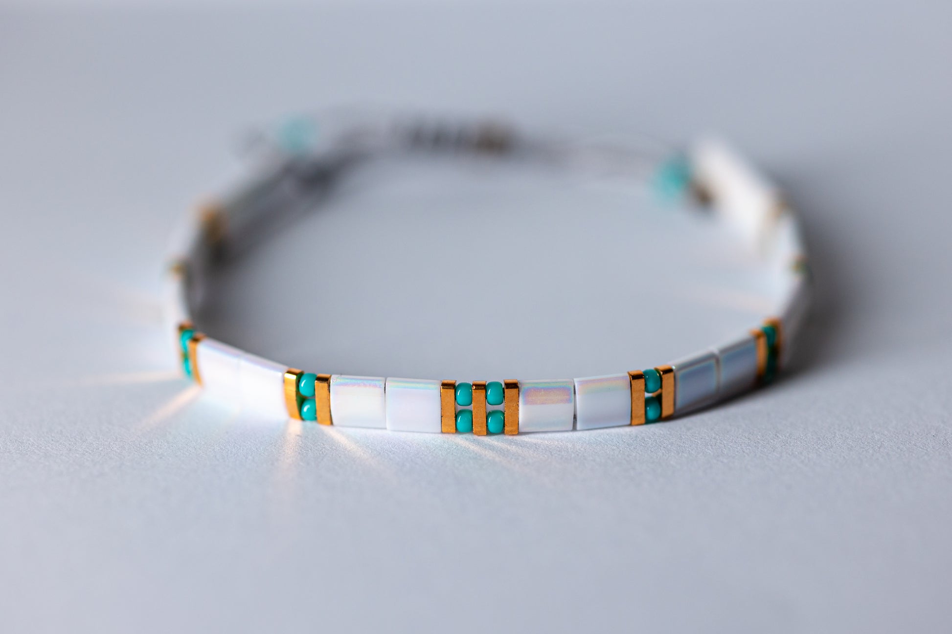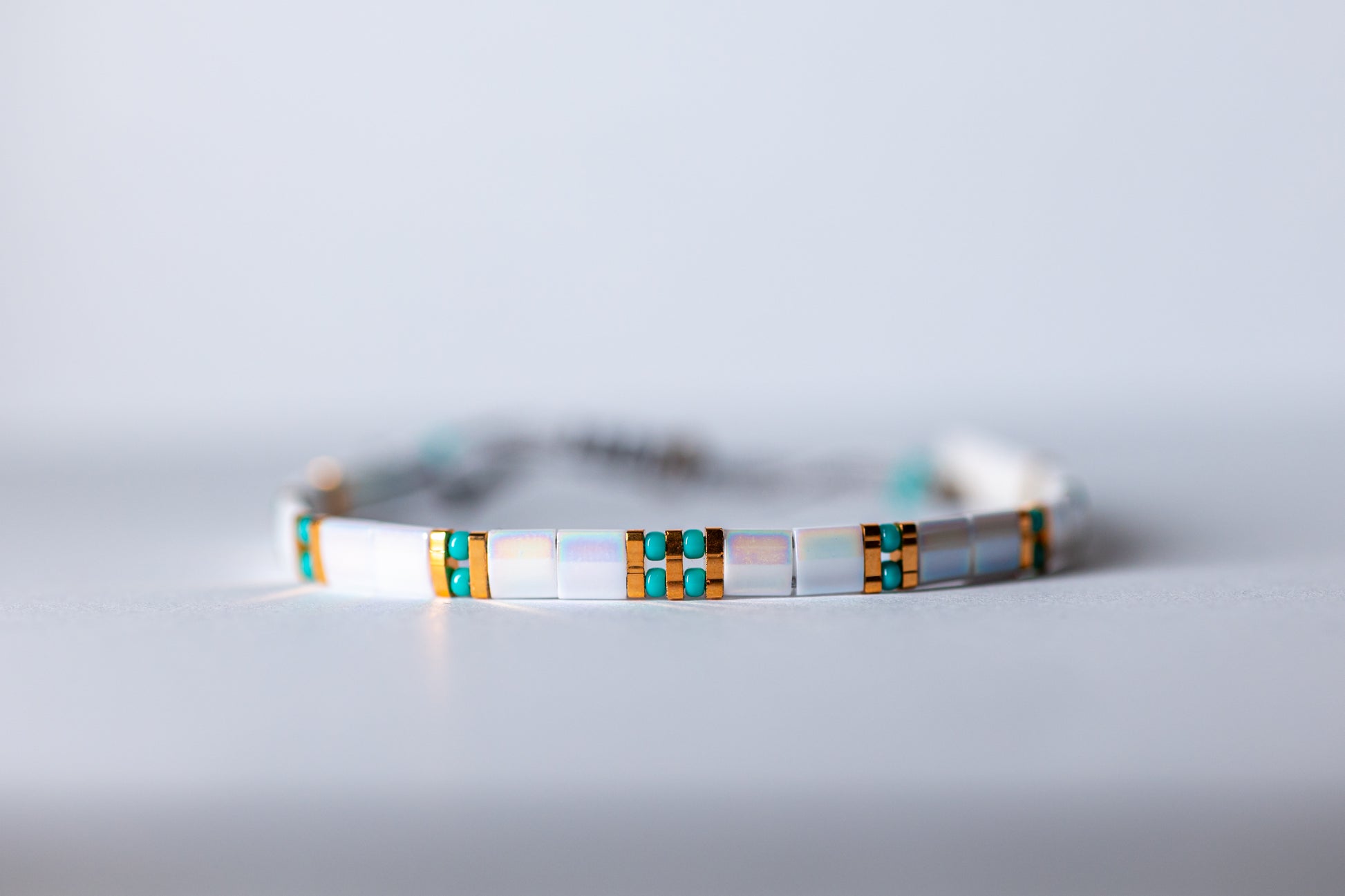 O brățară cu un design proaspăt și armonios, care combină liniile curate ale mărgelelor Tila albe cu accentele sofisticate ale quarter Tila placate cu aur și energia vibrantă a turcoazului. Turquoise-ul adaugă o notă fresh, echilibrată de eleganța albului și strălucirea aurului cald.