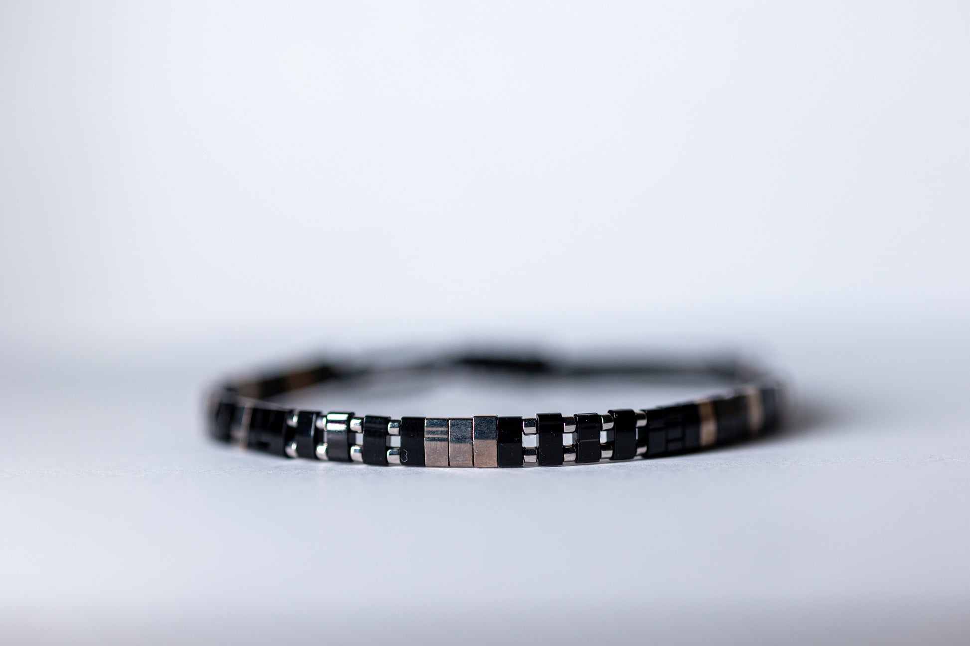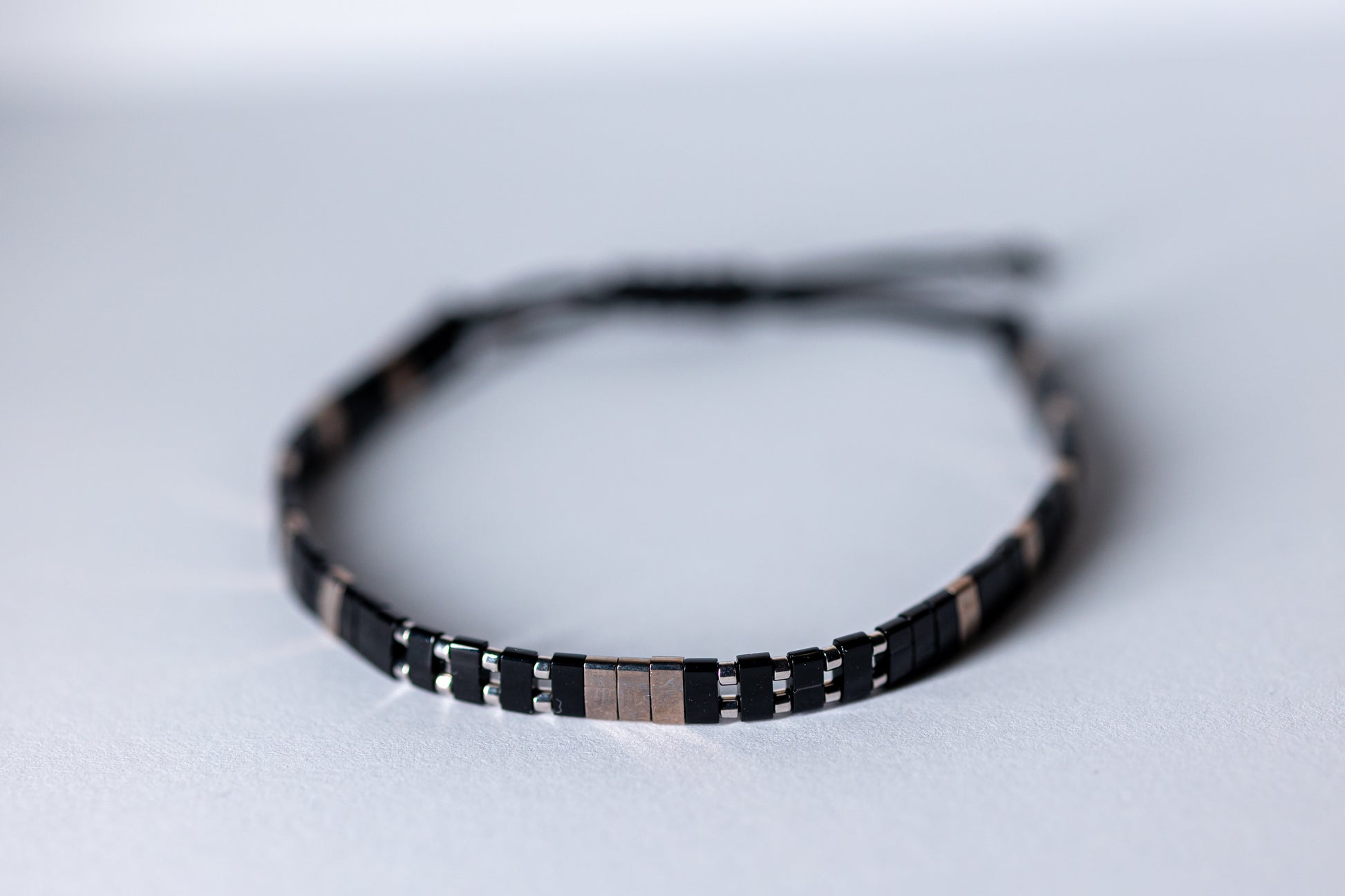 Această brățară handmade îmbină textura rece a mărgelelor placate cu nichel cu strălucirea caldă a mărgelelor half tila placate cu aur și profunzimea tonurilor negre. Un design echilibrat și sofisticat, ideal pentru un look modern, cu personalitate.
